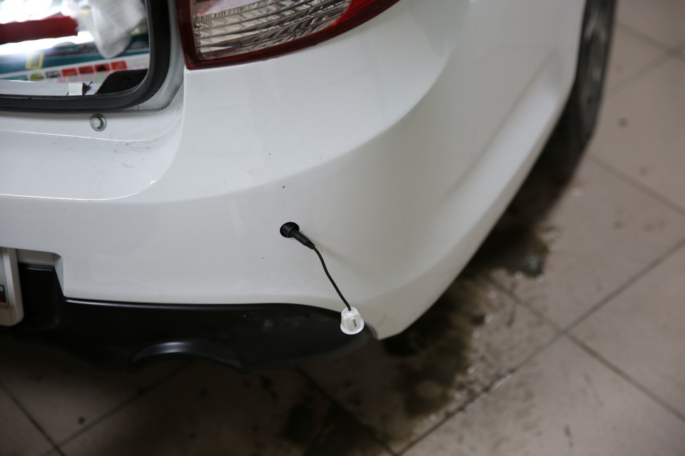 Будем работать под бампером и в багажнике. Первым делом, освобождаем багажник и снимаем обшивку. Провода от всех сенсоров сматываем вместе. Это можно сделать с помощью изоленты, хомутов или провести провода через гофру, которая также будет защищать их. Смотанные вместе провода проводим под бампером в багажник через технологическое отверстие. Если оно отсутствует — сверлим новое и после протяжки проводов заливаем герметиком.