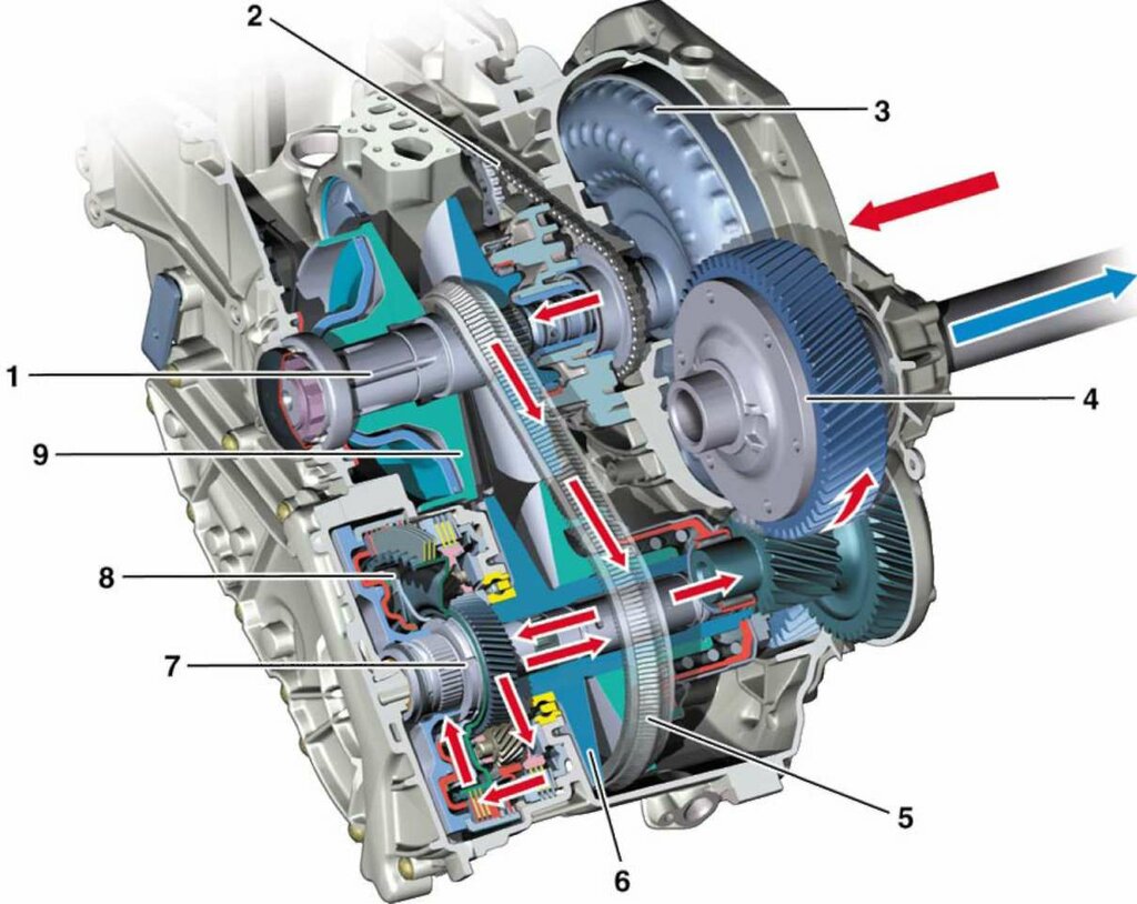От двигателя мощность сначала поступает в преобразователь крутящего момента , гидравлическую муфту, которая приводит в действие гидравлический насос и входной вал трансмиссии. Несколько планетарных шестерен выстроены в линию для достижения разных передаточных чисел.Их активация контролируется TCM. Когда двигатель работает на холостом ходу, селектор коробки передач находится в положении «D» (движение) и автомобиль неподвижен, на трансмиссию почти не передается крутящий момент. На этом этапе TCM, который может быть встроен в ECM (модуль управления двигателем), подает команду на сцепления и тормоза для выбора первой передачи. Включите акселератор, и преобразователь крутящего момента повысит давление и поток жидкости до точки, где он может начать движение входного вала трансмиссии.В зависимости от трансмиссии выходной вал трансмиссии соединяется с передним дифференциалом , раздаточной коробкой или задним дифференциалом для окончательного понижающего передаточного числа перед передачей мощности на колеса.