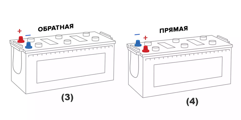 1. Полярность. Бывает «Прямая» (иногда обозначается «1») и «Обратная» (иногда обозначается «0»), означает расположение клем аккумулятора, (см.Рисунок).