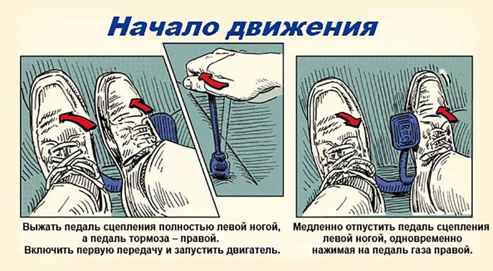 - Левой ногой постепенно ослабить силу натиска на педаль. Одновременно с этим слегка нажать правой ногой на газ. Авто начнёт плавно и медленно двигаться.
