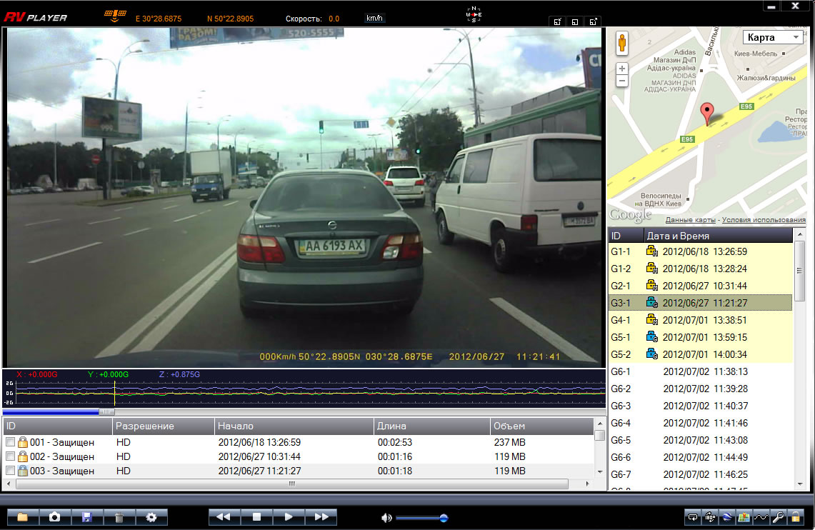 - Датчик удара G-сенсор. Его основное назначение – это защита видеозаписи от возможной циклической перезаписи в момент удара автомобиля или в момент экстренного торможения, ускоренного движения.