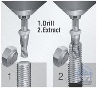 Сначала по центру обломка тонким сверлом делается отверстие. После этого его начинают медленно расширять до тех пор, пока от болта не останется только тонкая стенка с резьбой. Оставшийся металл аккуратно ломается и извлекается из отверстия.