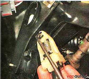 5. В салоне под панелью приборов ключом на 8 мм отворачиваем гайку крепления кронштейна оболочки троса к кронштейну педали сцепления.