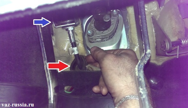 Снятие: 1) Сперва выньте резиновый пальник, который закрывает отверстия в которое трос сцепления выходит, чтобы в него грязь не попадала и влага (Данный пыльник указан красной стрелкой), как только он будет вынут, при помощи гаечного ключа «на 8» выверните гайку (Ищите в том месте которое синей стрелкой указано, гайку на фотографии правда видно плохо), благодаря которой упор оболочки троса крепится к кронштейну и как только гайка будет вывернута, снимите упор с кронштейна.