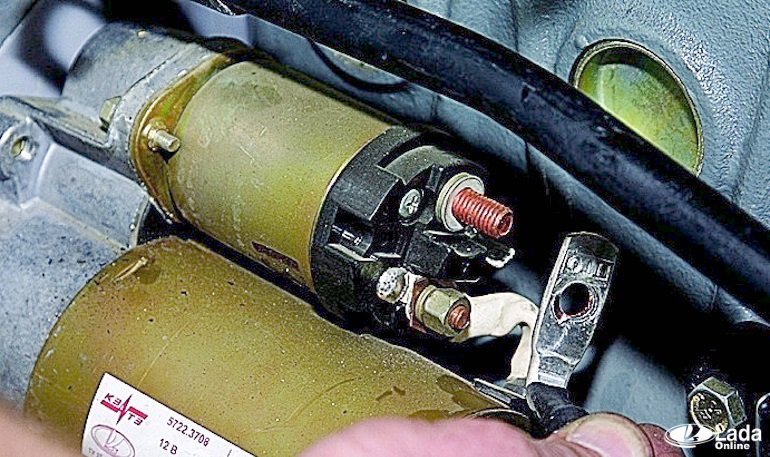 О проблемах со втягивающим свидетельствует характерное пощёлкивание во время поворота ключа в замке зажигания. Стартер в этот момент неспособен провернуть коленвал, так как зубья бендикса не цепляются за венец маховика. Замкнув силовые клеммы стартера, удастся пустить ток на электрообмотки напрямую. Гаечный ключ или отвёртка возьмут на себя функции тягового реле.
