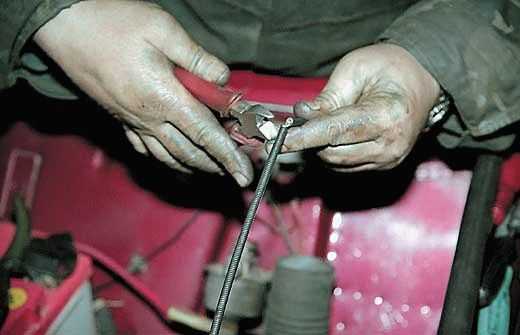 10. Протягиваем трос привода воздушной заслонки над крышкой головки цилиндров, подгоняем его по длине, обрезая кожух, и подключаем к карбюратору.