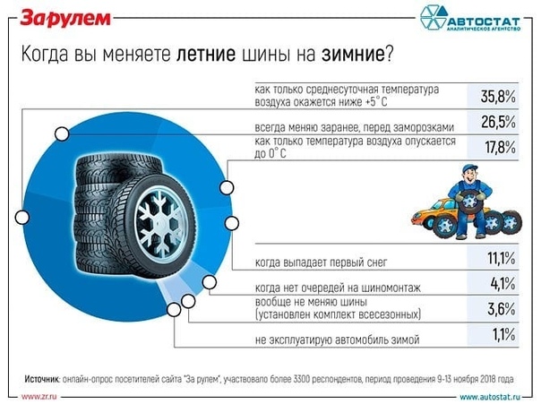 Эксперты рекомендуют менять летние шины на зимние при среднесуточной температуре от +5°С до +7°С.