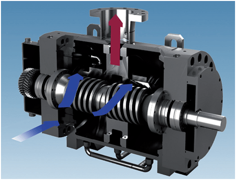 - Основные элементы представлены двумя винтовыми роторами: один вращается по часовой стрелке, второй против.