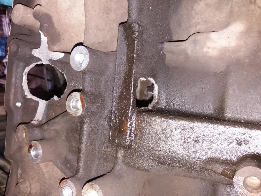 …) ну а еще — достаточно банальное расплавление шатунного вкладыша (они более нагружены чем коренные) и заклинивание го на коленвалу= тогда и может проломить но перед этим поршень все же должен расколоться в бобышках пальца….