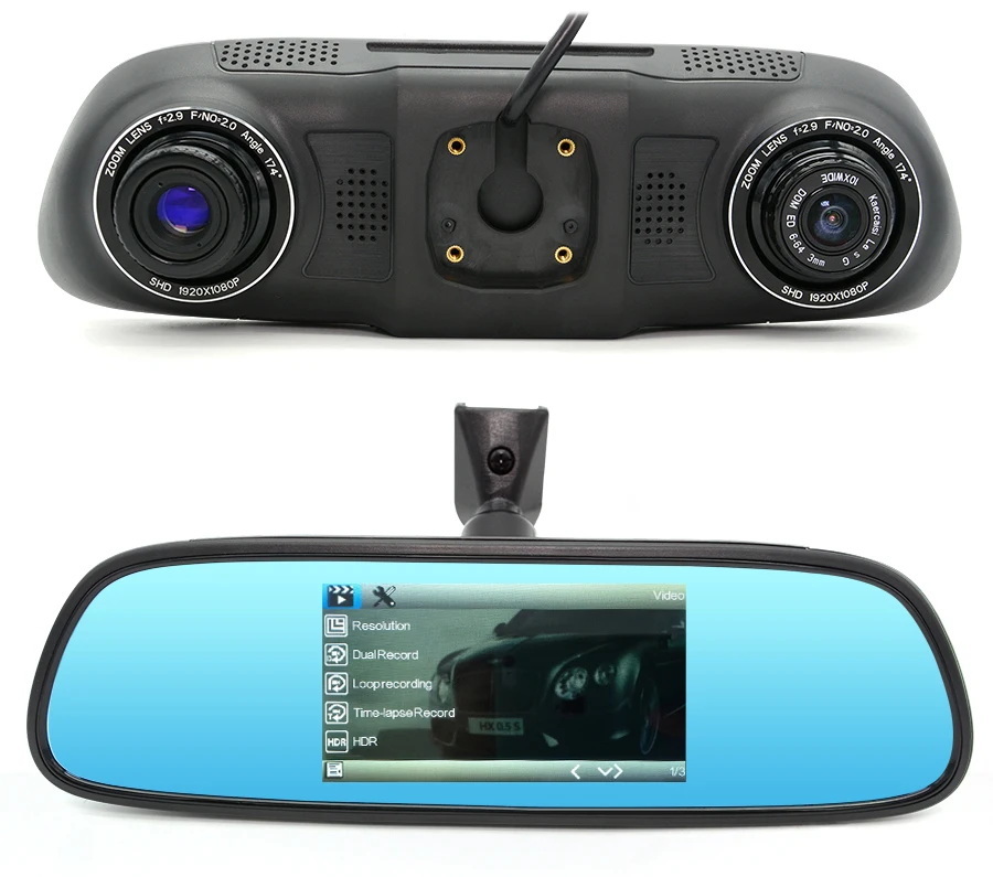Данный регистратор имеет невысокую цену (самая дешевая модель с креплением на зеркало в нашем списке) и популярен среди покупателей Алиэкспресс (более 4400 заказов в фирменном магазине) с рейтингом 96,7%). Двойная камера записывает одновременно с двух разных ракурсов. На дисплей выводится картинка с задней и фронтальной камер. Когда автомобиль делает задний ход, автоматически включается режим «парковка», с помощью которого передается обзор парковочной зоны. Еще один плюс — наличие функции G-shock.