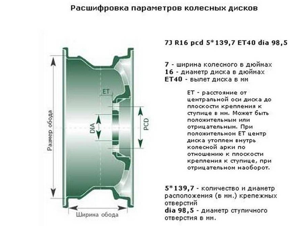 Первая цифра обозначает количество отверстий на колёсном диске, а вторая диаметр окружности крепежных отверстий; - Вылет диска. Данный показатель обязательно должен соответствовать рекомендациям производителя автомобиля;