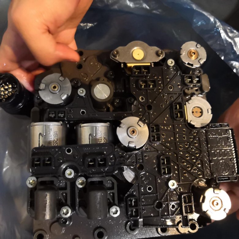 Плата управления помещается в пластиковый корпус и также фиксируется поверх гидроблока. Именно к ней будут подключаться электрические схемы машины и АКПП посредством круглых разъёмов. Контакты соленоидов подключаются к плате парами контактов и устанавливаются в один ряд, сверху и снизу.