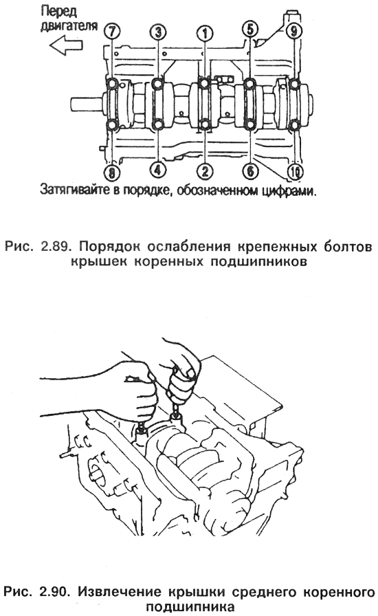 Последовательность затягивания болтов крепления крышек коренных подшипников