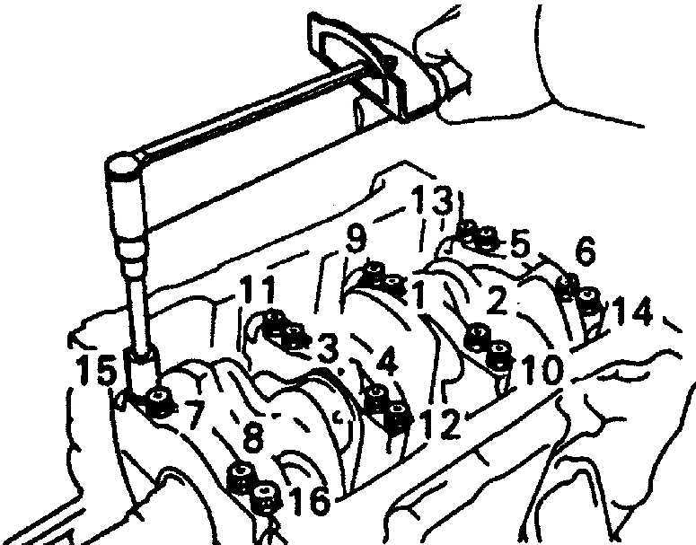 Равномерно затяните шестнадцать болтов крышек коренных подшипников в несколько проходов в последовательности, показанной на рисунке.