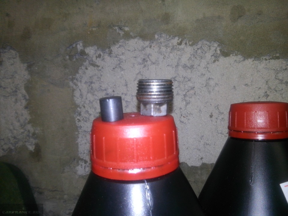 С бутылки заливать будет неудобно, поэтому нужна шлангочка подходящего диаметра и воронка. Тут лучше работать вдвоем (один заливает, другой смотрит, когда начнет вытекать через отверстие уровня), и как только перелилось закрутить пробку уровня и долить еще около 100 грамм, контрольный уровень показывает минимум.