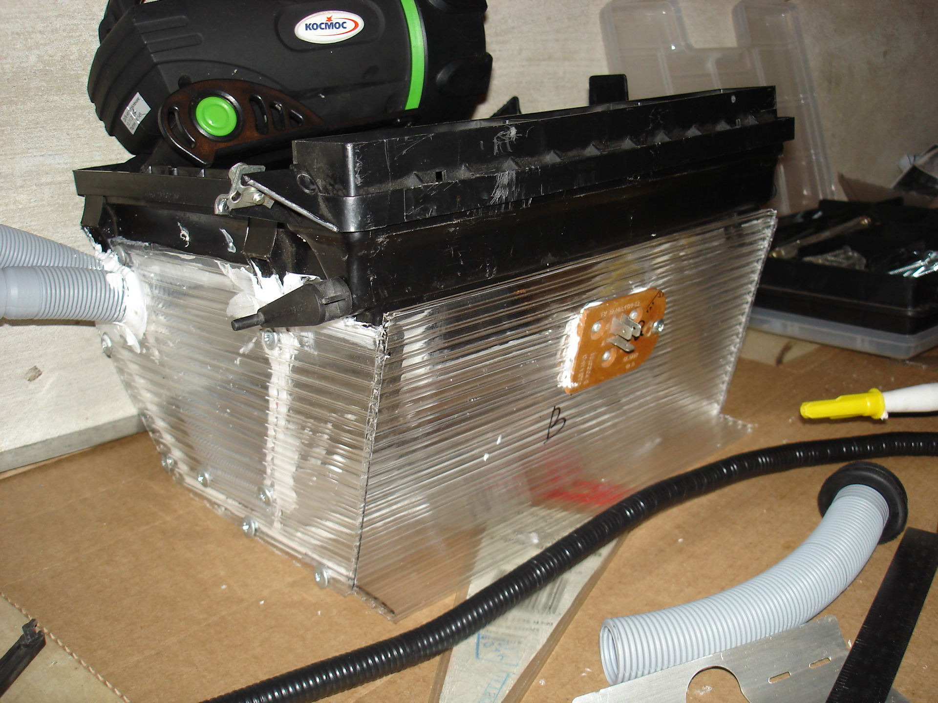 Начнем с полной разборки корпуса отопителя. Снизу печки срезано практически все, кроме крепления и каркаса. Далее делаем туловище улитки. Для этого можно использовать любой прочный материал — поликарбонат, пластик, оргстекло и т. Д.Четыре стенки будущего корпуса вырезаются из выбранного вами материала и прикручиваются к низу печки.