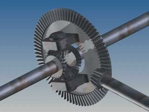 На рисунке ниже показан дифференциал грузовика. Можно увидеть шестерню (показана желтым на анимации выше) и коническую шестерню (показана оранжевым на анимации выше). Остальные конические шестерни находятся внутри корпуса и снаружи не видны.