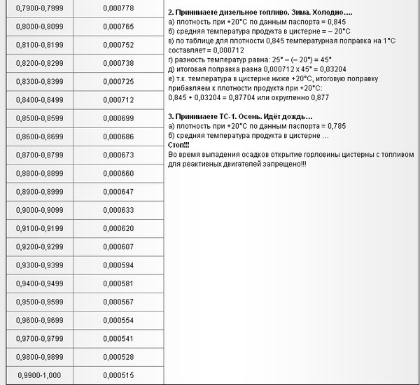 Вычисление удельной массы ДТ выполняют при 20 °С. Отклонение температуры требует корректировки на коэффициент. При нагреве топлива производят вычитание, при охлаждении – сложение.