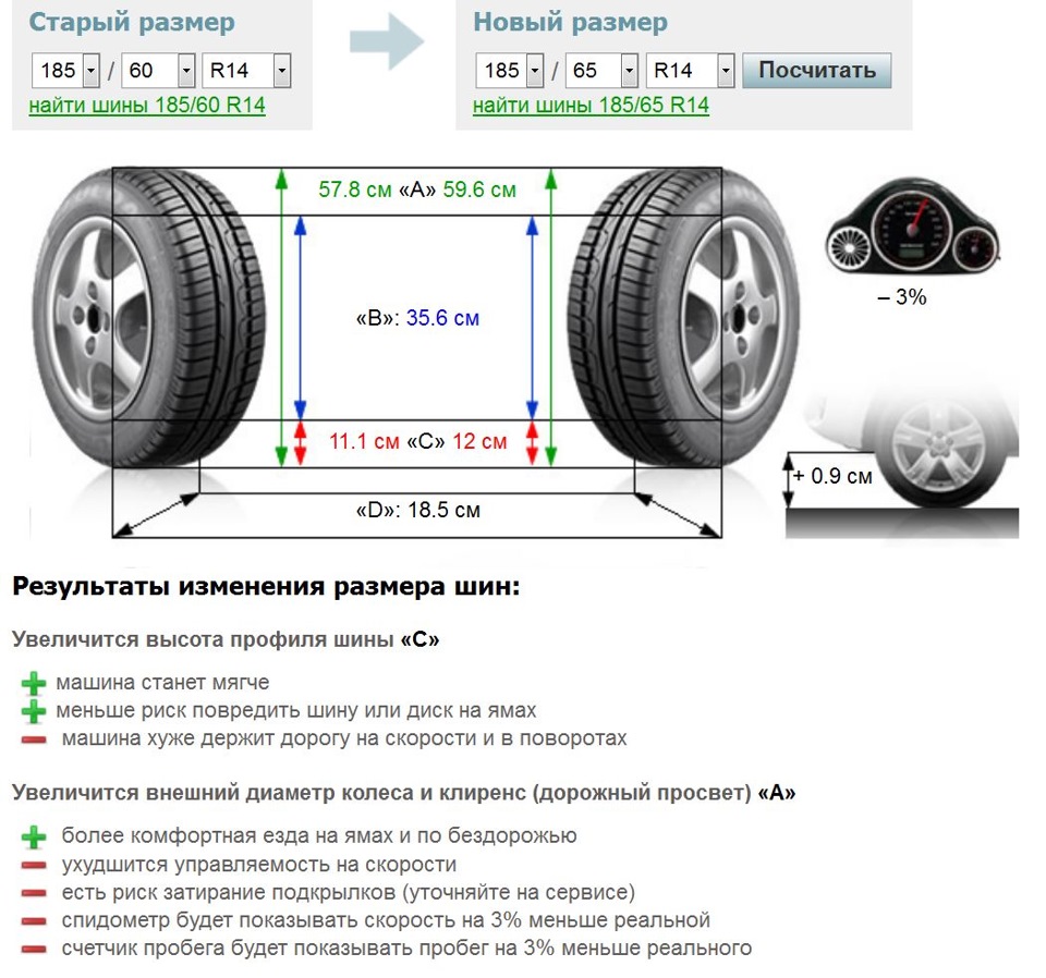 С помощью этого шинного калькулятора вы легко можете посчитать как изменятся: внешние размеры колеса, высота дорожного просвета (клиренс), показания спидометра и другие характеристики, при установке шин с другим типоразмером на ваш автомобиль.