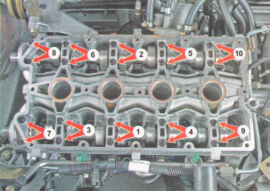 На фото изображен порядок затяжки гаек крепления головки; взято из «Руководства по эксплуатации»
