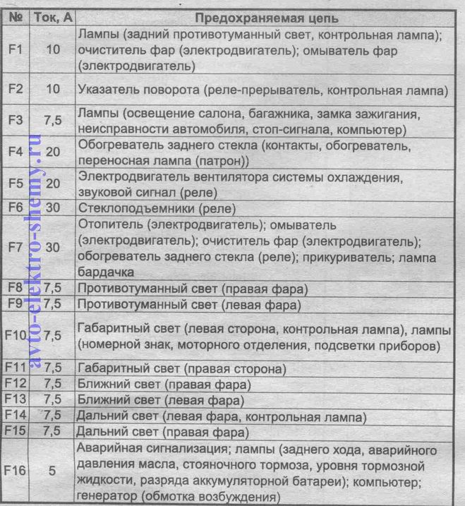 | Плафон подсветки бардачка, контрольная лампочка активации подогрева заднего окна, реле активации подогрева заднего окна, реле активации электровентилятора радиатора, электродвигатель омывателя ветрового окна, электродвигатель вентилятора печки | 30А | F7 |