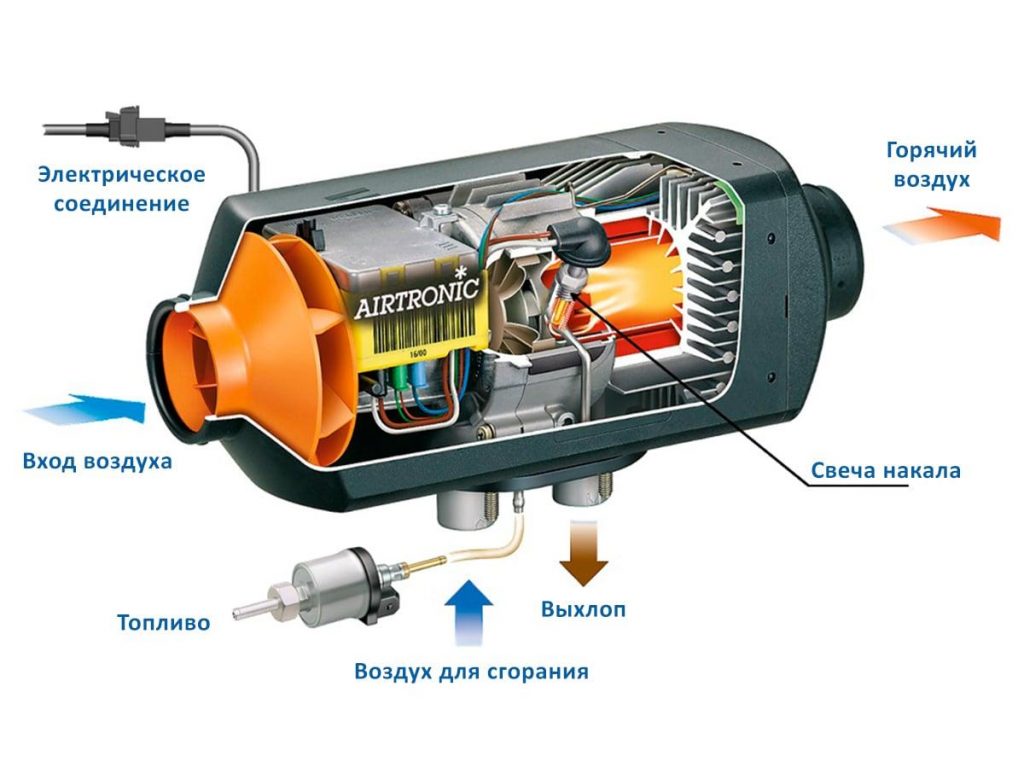 Принцип работы жидкостного отопителя достаточно прост. Устройство работает на топливе, которое в небольших количествах либо поступает из основного бака автомобиля, либо из собственного небольшого резервуара отопителя. Топливо поступает в камеру сгорания, в результате его сжигания в камере выделяется тепло, оно передается охлаждающей жидкости, которая затем нагревает двигатель.