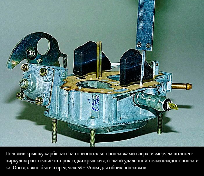 - измерение расстояний от поверхности топлива до крышки. Нормативные значения составляют 24,0+1,0 мм. Если размеры иные — проводится корректировка с помощью поджимания язычков поплавков.