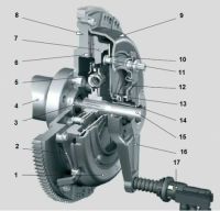 3. Выжимной подшипник. На защитной конической трубе первичного гребного вала двигателя крепиться выжимной подшипник, представляющий собой округлую нажимную площадку. С его помощью активируется система привода. Он выполняет свои действия посредством оттягивающих или нажимных движений.