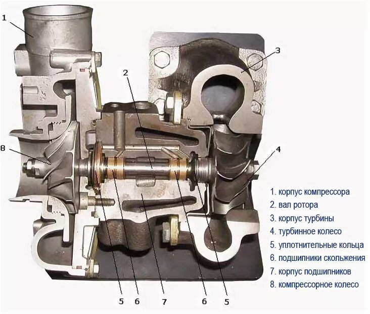 Так как обе части улиток турбокомпрессора соединены единым валом, то от вращения колеса турбины с той же скоростью начинает вращаться и колесо компрессора турбины, которое соединено с впускной системой двигателя.