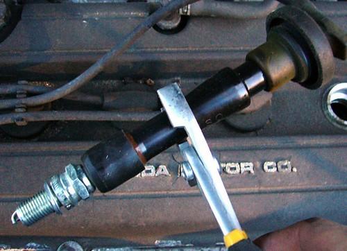 Вы прикладываете провод свечи зажигания к участку катушки разъема провода. Затем нажимаете острую 3/ 16-дюймовый участок провода. В проводе уже должно быть отверстие. Прямой отрезок провода должен плотно прилегать к проводу свечи зажигания с участком катушки на конце. Затем вы можете снова надеть ботинок, продев длинное отверстие небольшого диаметра над катушкой и возвращая его назад, пока не увидите, что катушка выходит из большого отверстия ботинка. Иногда небольшое количество смазки на резиновом чехле облегчает надевание.
