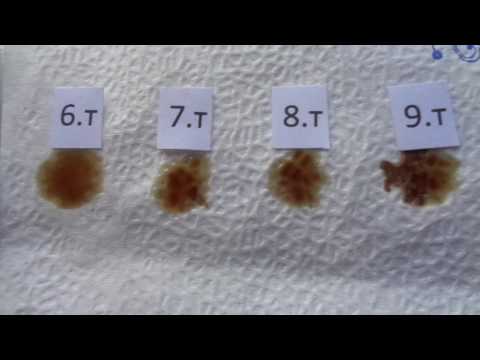 Наиболее информативным органолептическим методом является метод промокательных пятен. Для его выполнения необходимо заглушить прогретый двигатель, вынуть щуп и капнуть 2 капли на фильтровальную бумагу (или любую белую бумагу низкой плотности). Для сравнения результатов всегда используйте один и тот же тип бумаги. Бумагу с каплей положить в теплое место на 5-10 минут. Положите его на ровную поверхность, чтобы капля масла могла растечься горизонтально.