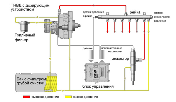 К ТНВД топливо поступает из бака, проходя через фильтр тонкой очистки и избавляясь по пути от примесей. Далее ТНВД распределяет топливо строго дозированными порциями — бензин или дизель попадает в форсунки, а оттуда в камеры сгорания. Топливо, которое по каким-то причинам не прошло путь от начала до конца (например, попало в зазор между иглой и корпусом распылителя), отправляется в сливной топливопровод.