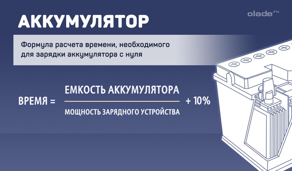 Расчетное время зарядки (без потери эффективности) = Емкость аккумулятора / ток заряда