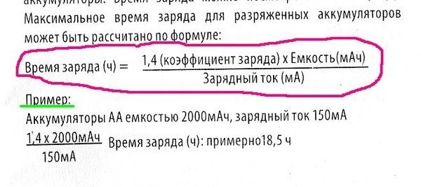 Расчет зарядки аккумуляторных батареек будет выглядеть следующим образом: T=1,4 C/I. Здесь имеются показатели время зарядки, емкость и ток зарядного устройства. На практике эти данные могут отличаться на процентов 20, ведь время зарядки аккумуляторных батареек зависит от качества изделий, правильного форматирования и температуры окружающей среды.
