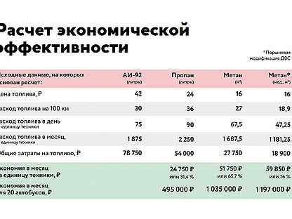 Поделите месячный пробег Вашего авто на расход бензина и умножьте на его цену. Таким образом Вы подсчитаете затраты на этот вид топлива в месяц. Эти же вычисления проведите для газа с учетом того, что на системах моновпрыска расход газа, как правило, на 10-20% больше расхода бензина. Разница этих двух цифр — и есть экономия в месяц. Последний шаг — сравнить ее со стоимостью газовой установки оборудования.