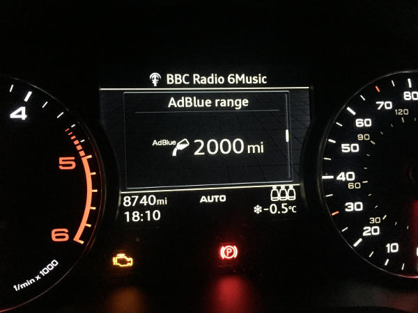 - Вначале появляется сигнал «Долить AdBlue», если ее уровня хватает еще более чем на 2000 км пробега;