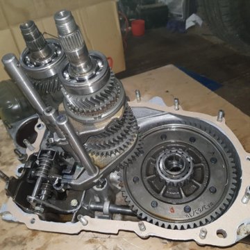 Каждая шестерня отвечает за свою скорость, самая нижняя это будет первая скорость, вторая скорость следующая, и так далее, шестерня отвечающая за заднюю скорость находится отдельно на валу.
