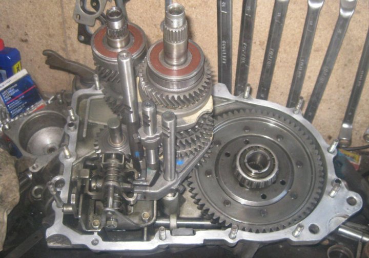 Чтобы снять весь блок шестерен, надо сначала открутить механизм переключения скоростей (три болта) и вытащить его, но внимательно посмотрите, как он стоит, и куда входит кулиса переключения скоростей, чтобы собрали также.