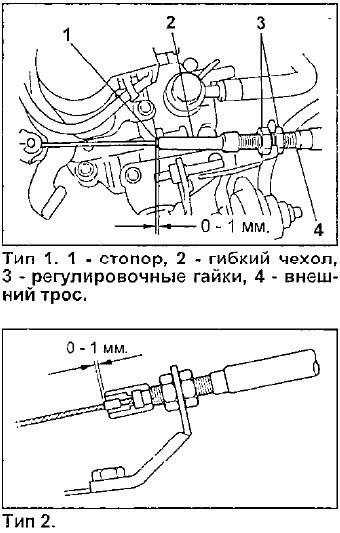 Помощник садится за руль, регулировщик ослабляет регулировочные контргайки полностью — так, чтобы резьбовая часть оболочки троса "болталась" на кронштейне свободно лучше всего между контргайками сделать расстояние 1.