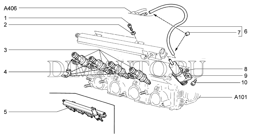 1 – защитный колпачок резьбового штуцера; 2 – топливная рампа; 3 – штуцер подсоединения подводящего топливопровода; 4 – держатель подводящего топливопровода; 5 – форсунка; 6 – уплотнительное кольцо форсунки