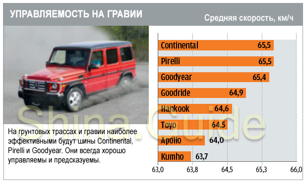 Серьёзный недостаток шин Goodyear – слабая эффективность торможения на мокром асфальте (отставание от Michelin около 12 м) легко нивелировался в глазах испытателей высокой устойчивостью к аквапланированию и отличным управляемостью.
