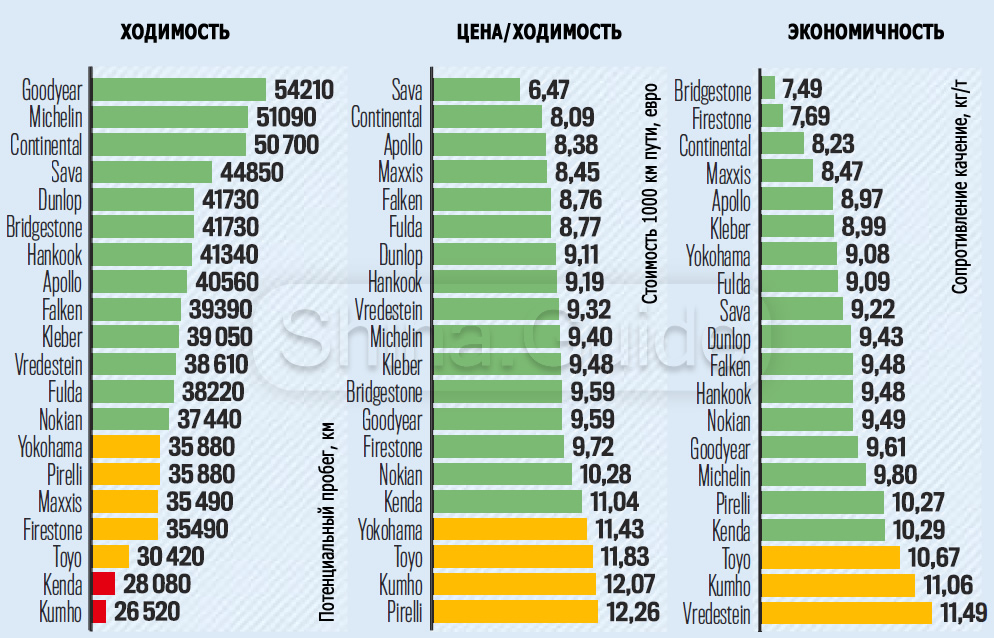 Специалисты автомобильного клуба провели 12 испытаний на сухой и мокрой дороге, проверили экономичность, износостойкость, акустический комфорт.
