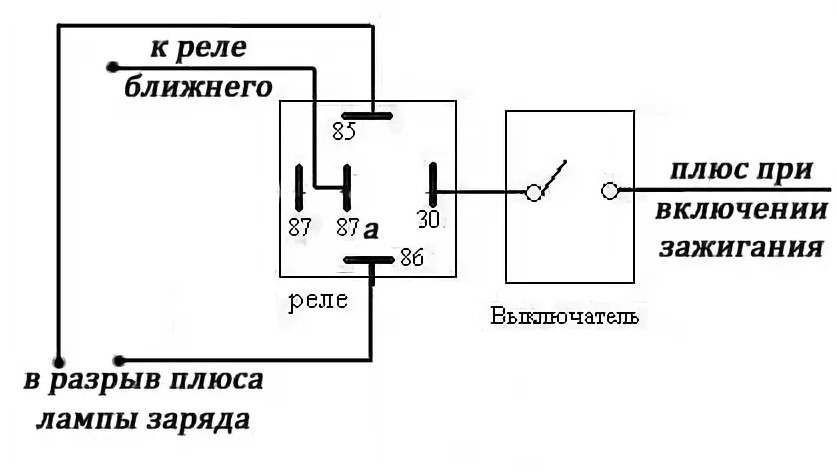 , обмотка реле дальнего света которых постоянно подключена к «массе» и имеет полярность контактов «30» — минус, «87»- плюс