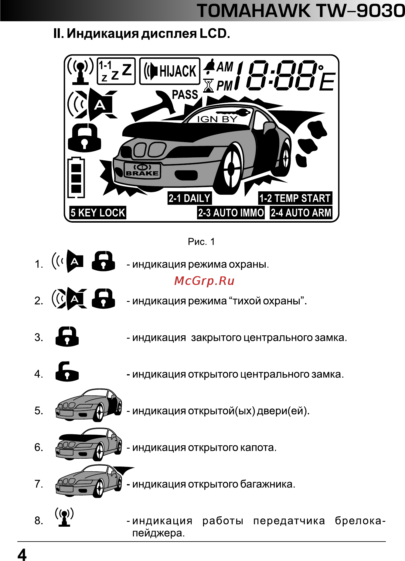Устройство состоит из основного блока, антенны (трансивера), датчика удара, брелока, сервисной кнопки и светодиодного индикатора.Системы охранной сигнализации Томагавк (Tomahawk), сочетающие в себе множество технических и функциональных возможностей наряду с невысокой ценой, пользуются большой популярностью у автомобилистов. У каждой модели Томагавка есть подробная инструкция по использованию этого электронного устройства, в которой подробно описано, как отключается сигнализация. Если инструкция утеряна или ее просто нет, то для выключения будильника нужно один раз нажать вторую кнопку на брелоке к нему (всего 2 кнопки и светодиодный индикатор). В этом случае сирена издаст 2 звуковых сигнала, а затем мигают габаритные огни, которые также мигнут дважды.После этого двери откроются и светодиод погаснет. Чтобы бесшумно выключить охрану, нажмите один раз кнопку ключа 1 на брелоке и сразу ключ номер 2. Затем габаритные огни мигнут дважды, двери откроются и светодиод погаснет. Если аккумулятор в брелоке или вы его потеряли, происходит аварийное отключение автосигнализации. Для этого сядьте в машину и закройте дверь. Выключите / включите зажигание столько раз, сколько указано в вашем PIN-коде, и интервал между включением / выключением должен быть менее 1 секунды.Подождите 30 секунд, система автоматически снимется с охраны. Такой способ аварийного отключения автосигнализации подходит для более старых моделей Tomahawk. Для более новых версий этого электронного устройства аварийное отключение выполняется следующими действиями: заглушить двигатель. Включите зажигание и 4 раза нажмите кнопку Override. После этого выключите зажигание. Парковочные огни мигнут дважды, сирена издаст 2 звуковых сигнала, тем самым подтверждая отключение охраны. Как просто