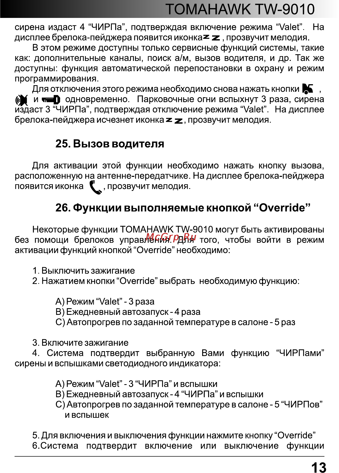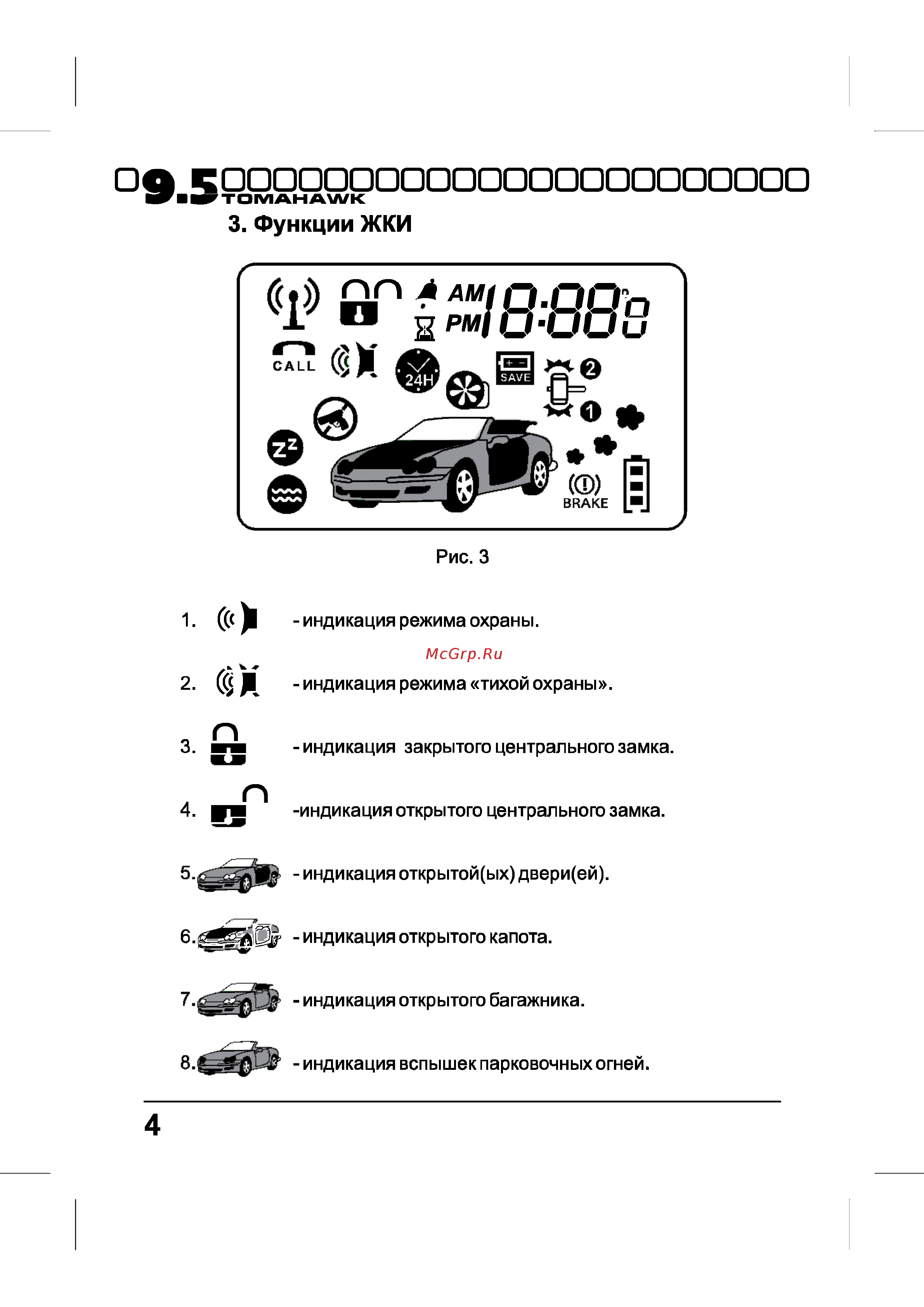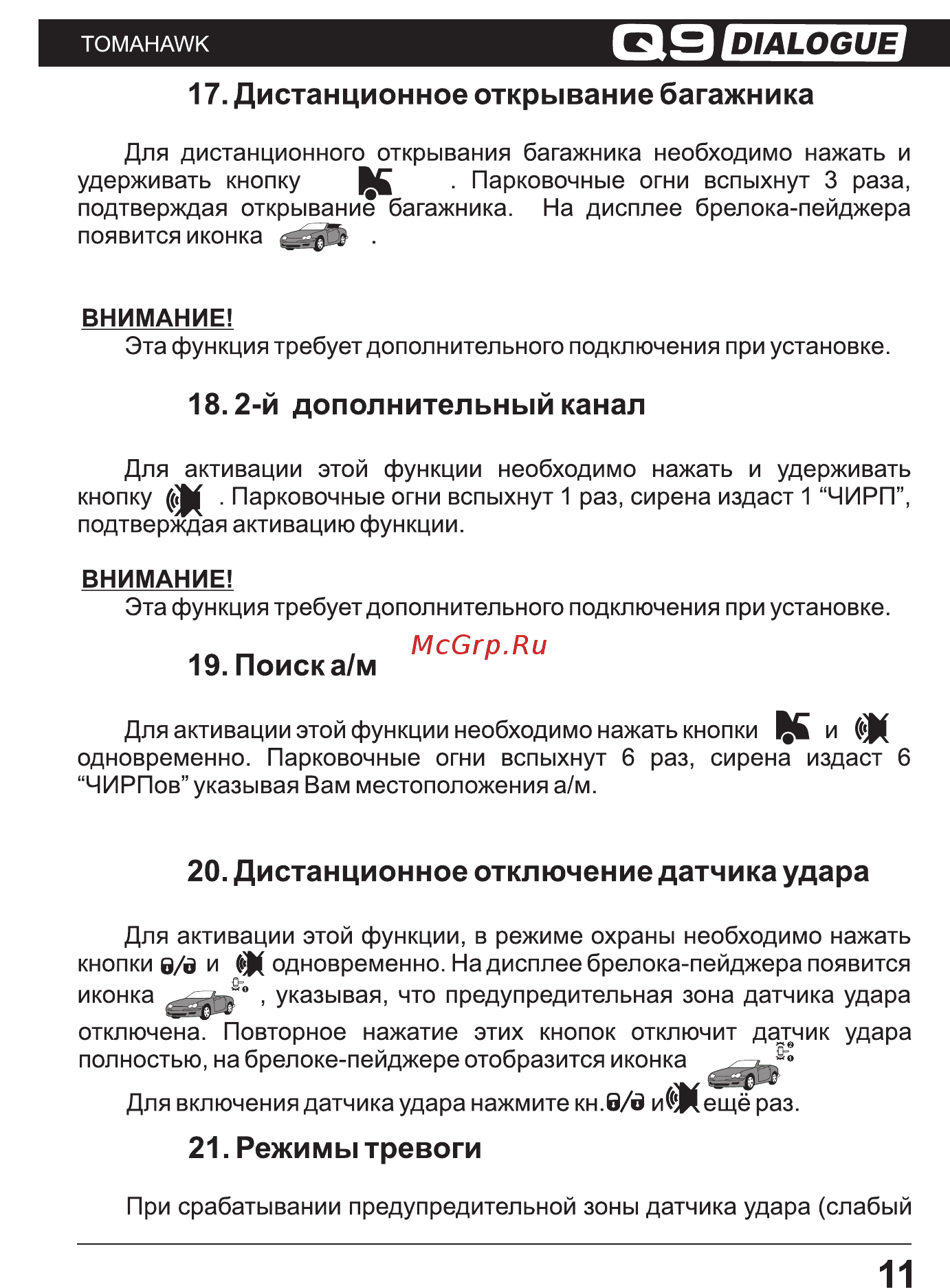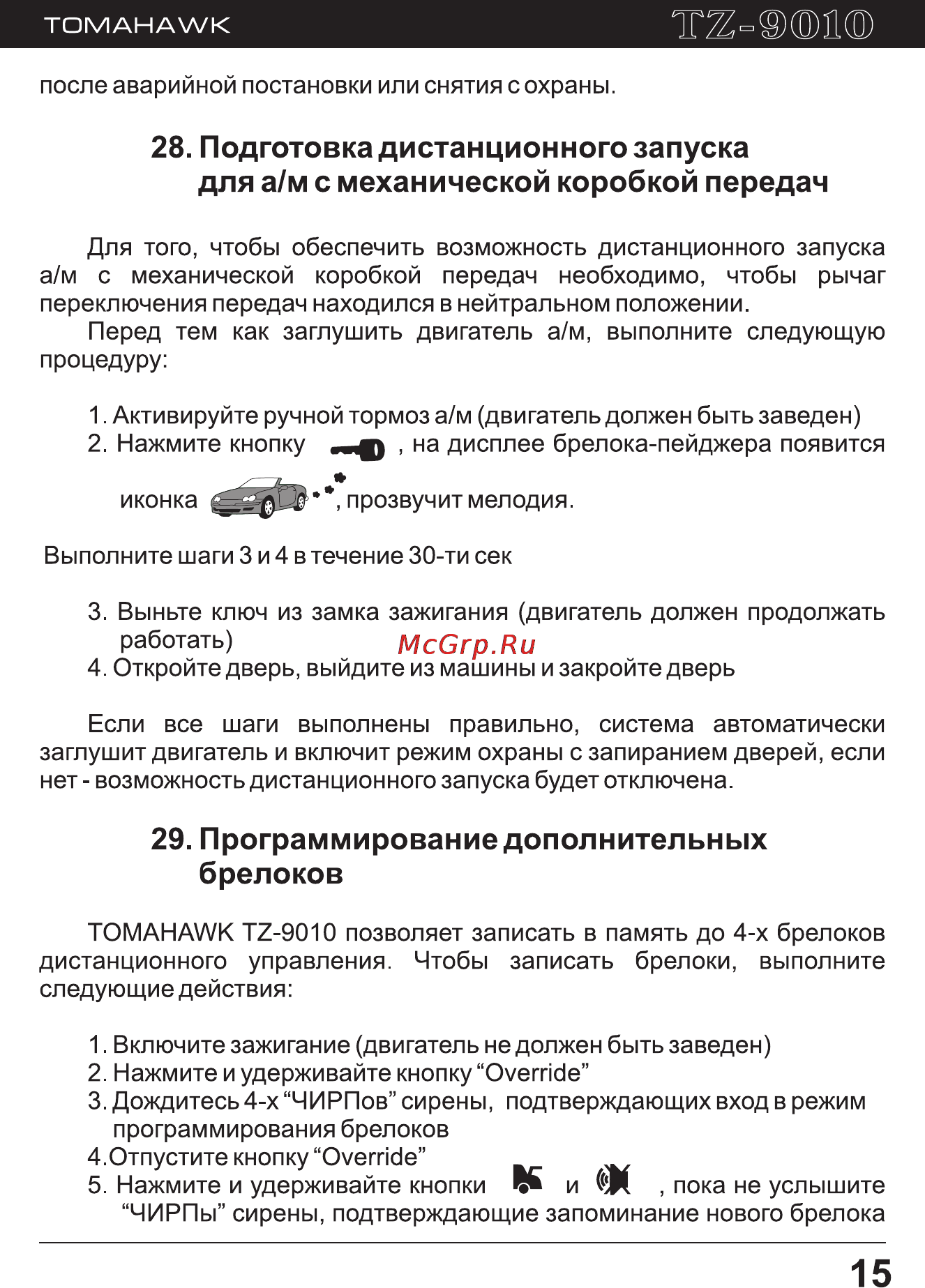 У различных модификаций сигнализационного комплекта похожая инструкция по эксплуатации. «Томагавк 9010» имеет следующие важные опции: