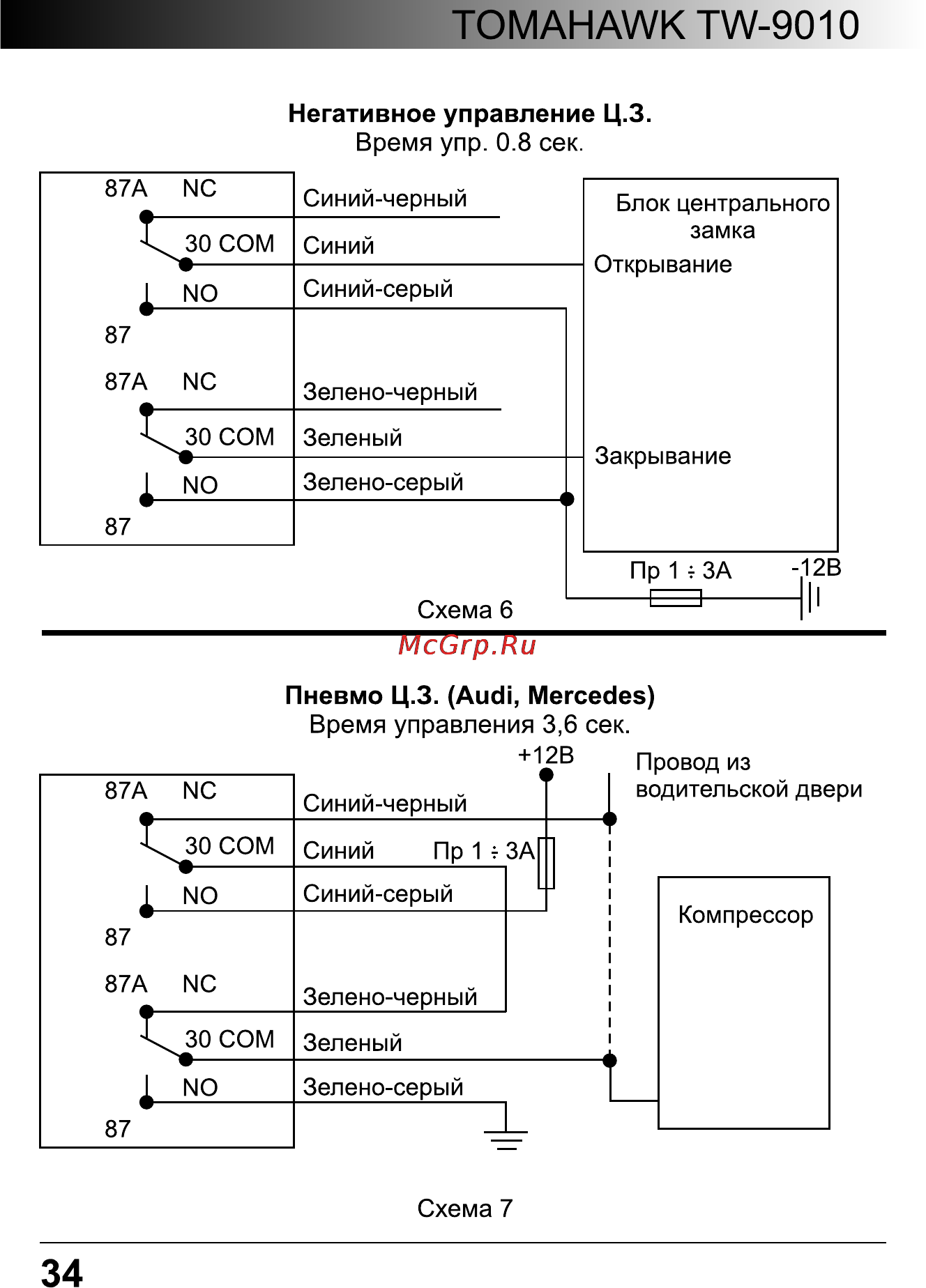 Он подключается к клемме зажигания через предохранитель 40А. Синий провод — центральный контакт для реле открытия центрального замка Синий и серый провод — нормально разомкнутый контакт для реле открытия центрального замка Синий и черный провод — нормально закрытый контакт для реле открытия центрального замка Зеленый провод — центральный контакт для реле блокировки центрального замка Зеленый и серый провод — нормально разомкнутый контакт для реле закрывания центрального замка. Черный провод — система — Этот провод может стать необходимым, если замок зажигания транспортного средства, на котором установлена система, имеет более двух цепей зажигания или для включения байпасных модулей иммобилайзера.
