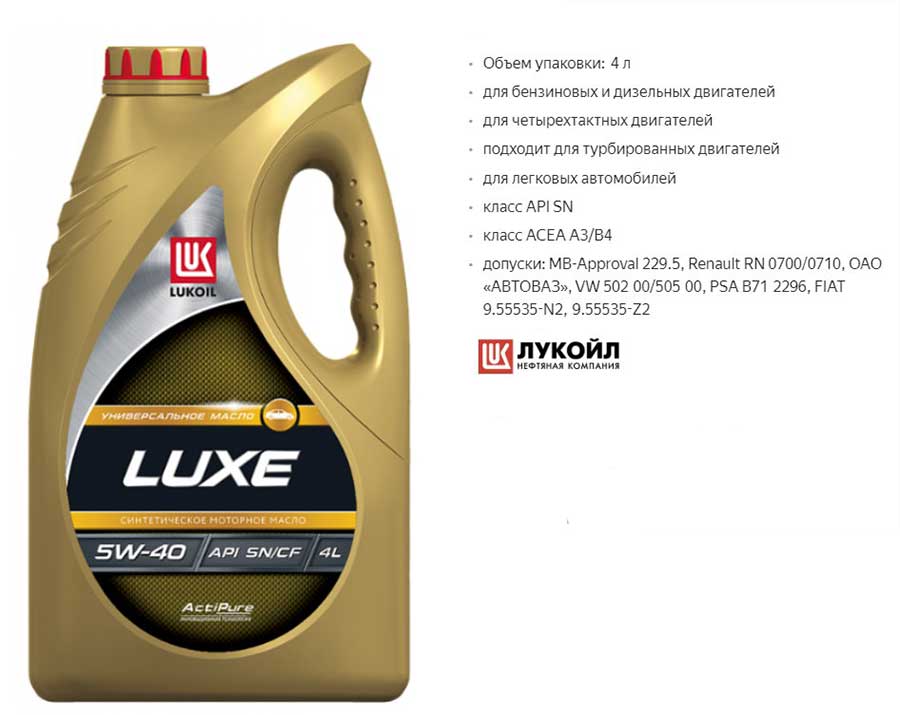 Предназначено для смазки автомобильных бензиновых двигателей с высокой скоростью вращения, для фургонов и легких грузовиков, отвечающих требованиям по выбросам Евро-5. Моторные масла Tatneft LUXE эффективно гарантируют длительный срок службы бензиновых двигателей.