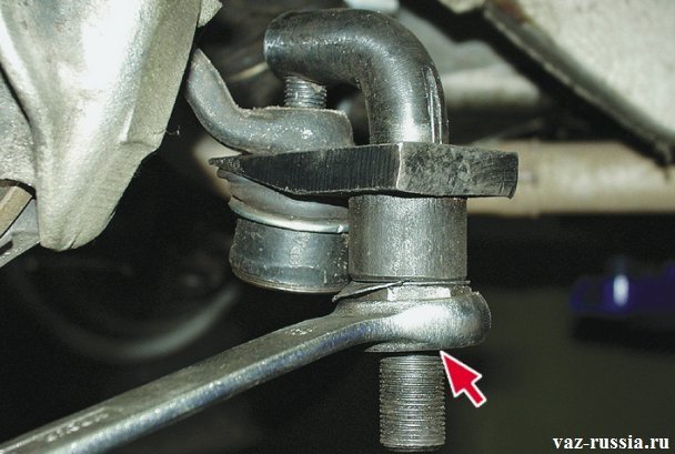 Демонтаж пальцев рулевых наконечников при помощи клина осуществляется так: тонкая сторона съемника забивается ударами молотка в щель между шарниром наконечника и поворотным кулаком. По мере продвижения приспособления, наконечник рулевой тяги будет постепенно освобождаться, пока месть полностью не выдвинется из уха.