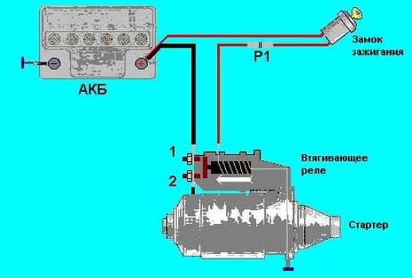 Один из них (толстого сечения) идет с положительной клеммы батареи, а второй (тонкого сечения) направляется с положительной клеммы управления замка зажигания. Имеется у реле и третий вывод (толстого сечения), который соединяет его с мотором стартера.