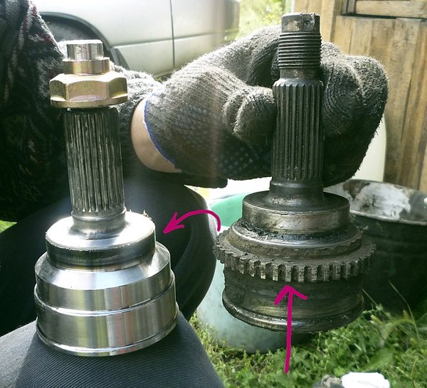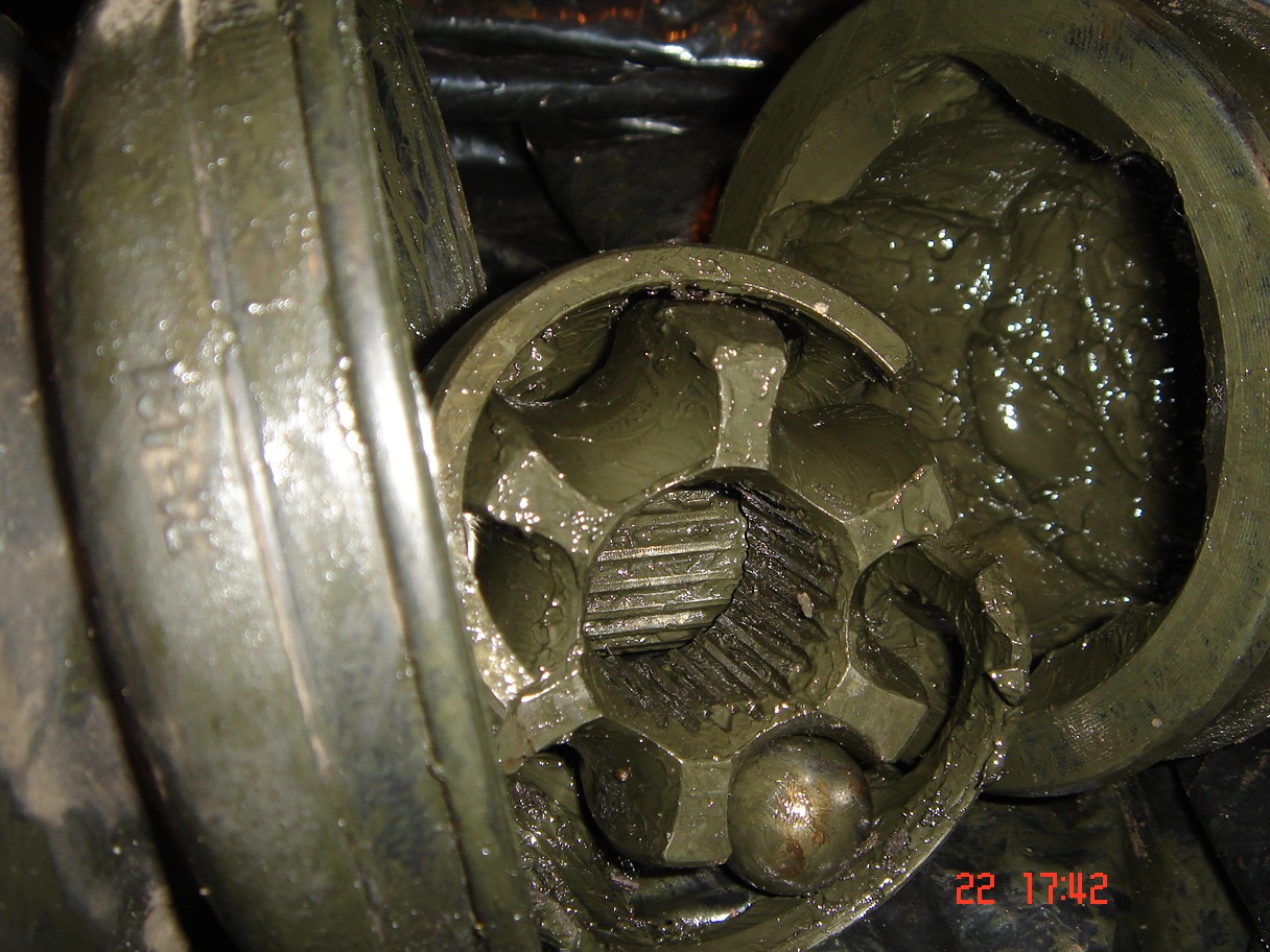 Проблемный шарнир надо снять и осмотреть. Шариковый ШРУС можно не менять, достаточно удалить смазку, промыть в керосине и протереть. В случае если шарики и элементы конструкции целы, его собирают, наполняют свежей смазкой и устанавливают назад. Трипоидные ШРУСы целесообразнее менять, используя только ту смазку, которая рекомендуется при их покупке.